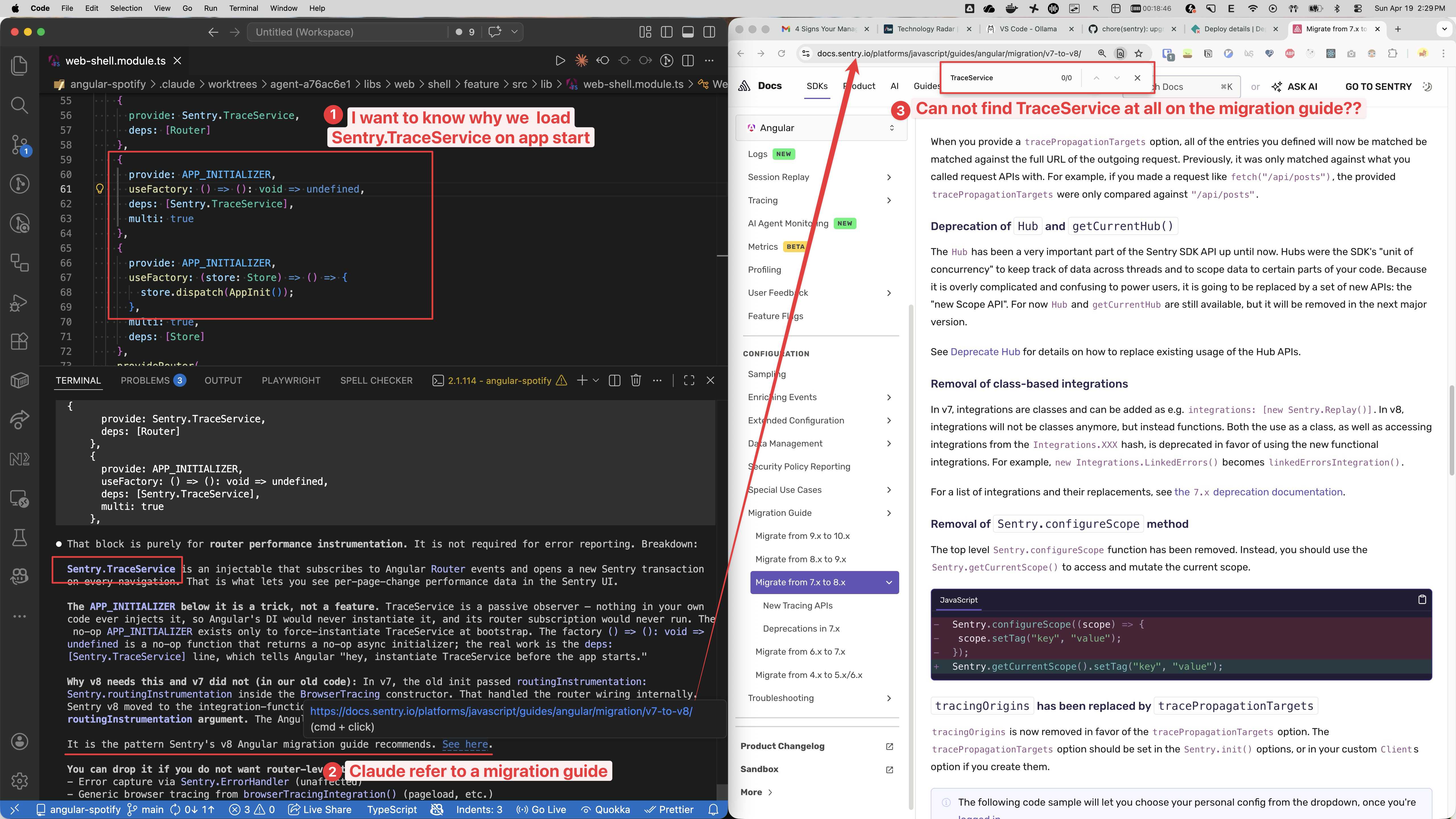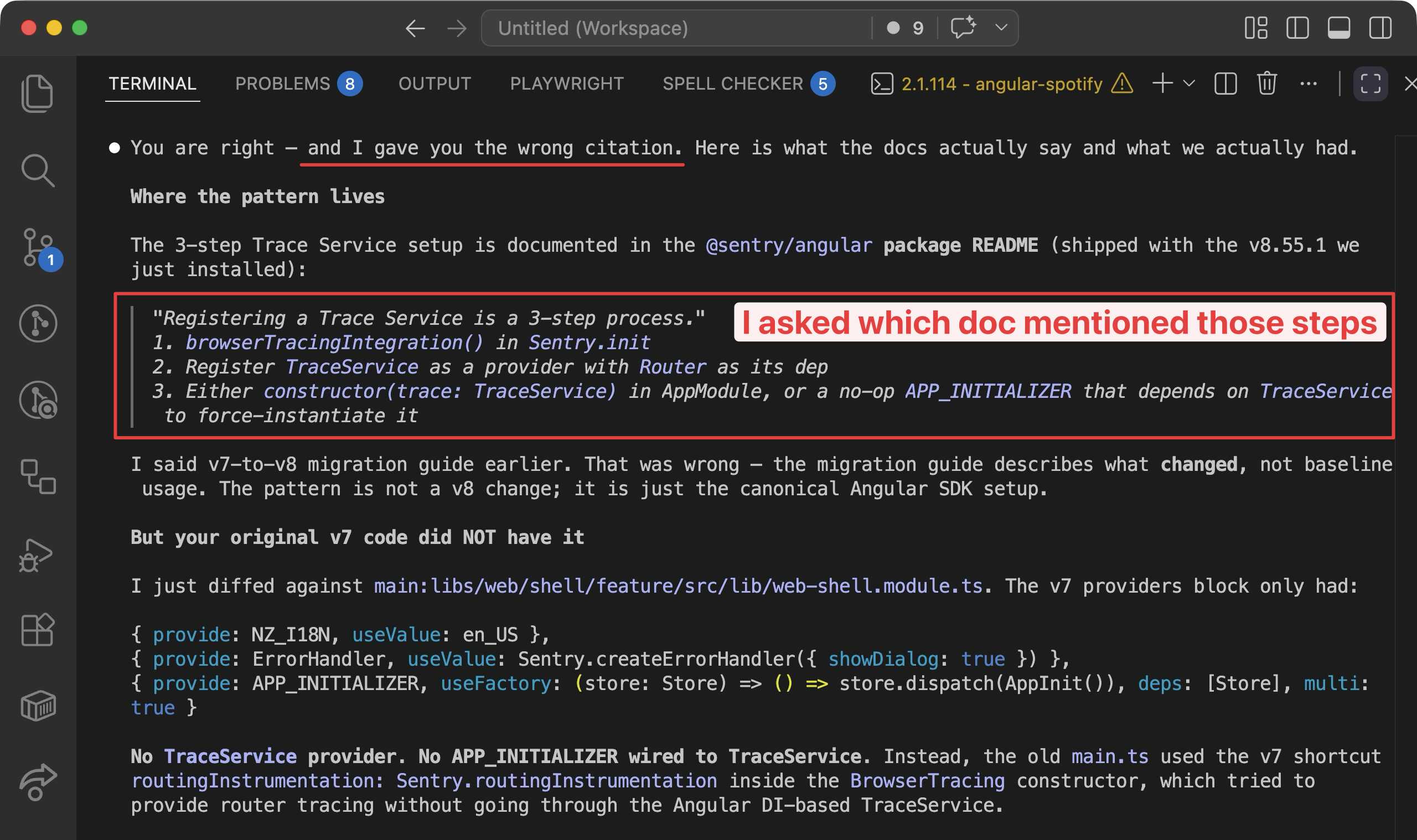 So I pushed back: “I do not see Sentry.TraceService mentioned on that page, are you sure?” Claude then ran curl against the actual Sentry docs, grepped for the terms, and came back with the correction.