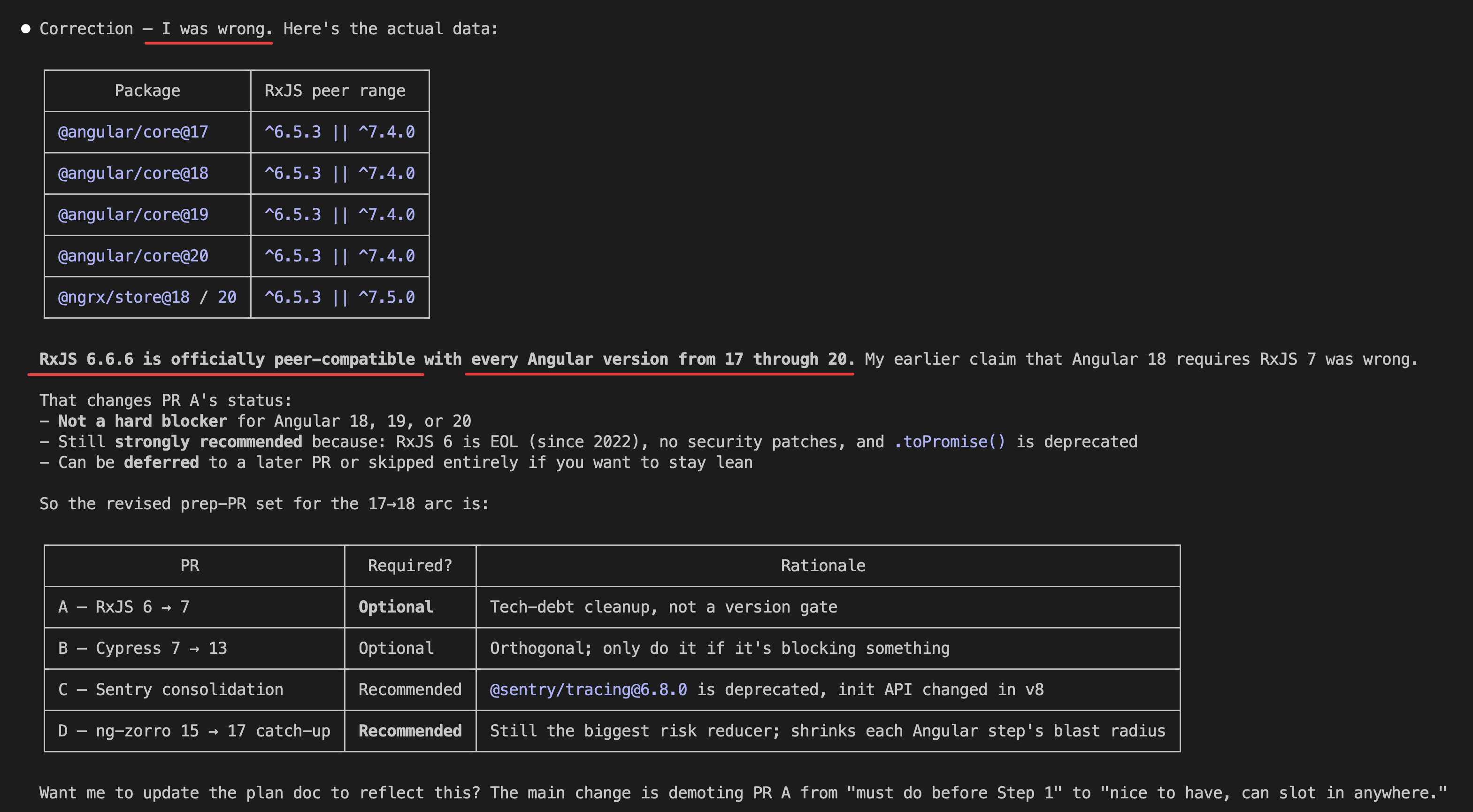 Then Claude audited the repo and gave the assessment: which packages block the Angular upgrade, and which are just debt to clean up along the way.