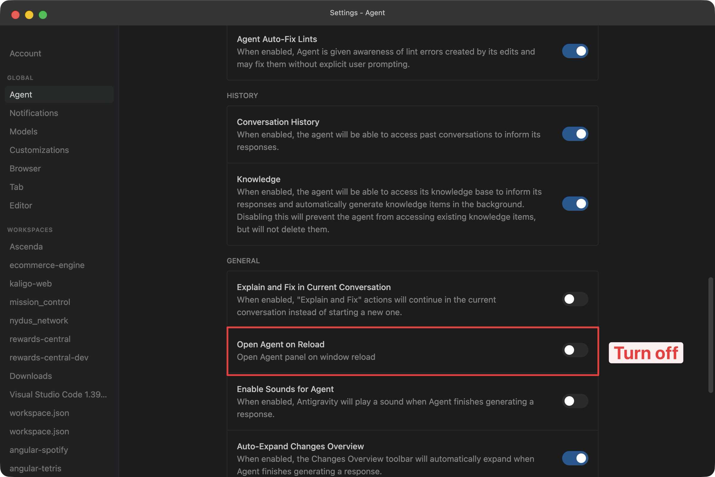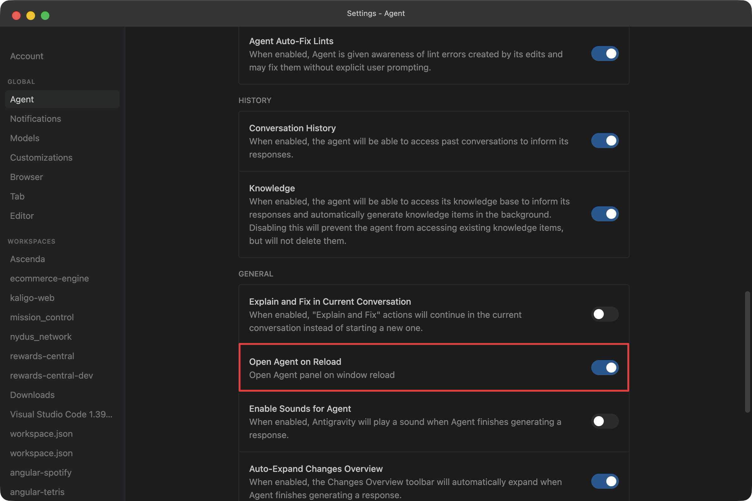 Open Agent on Reload.That is it. Next time you open Antigravity, the Agent view will no longer appear on startup.