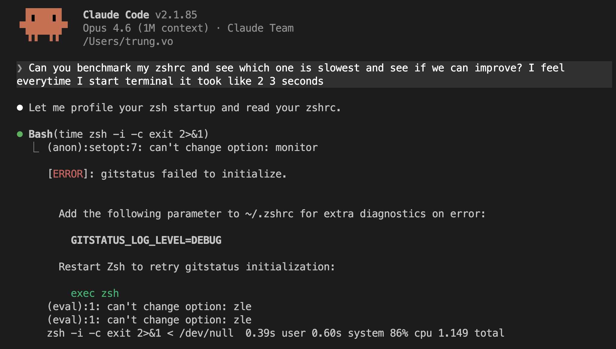 Since I use Claude Code for almost everything now, I started a session and asked it to investigate. It profiled my shell, found the bottleneck, and suggested the fix. Here is what we found.