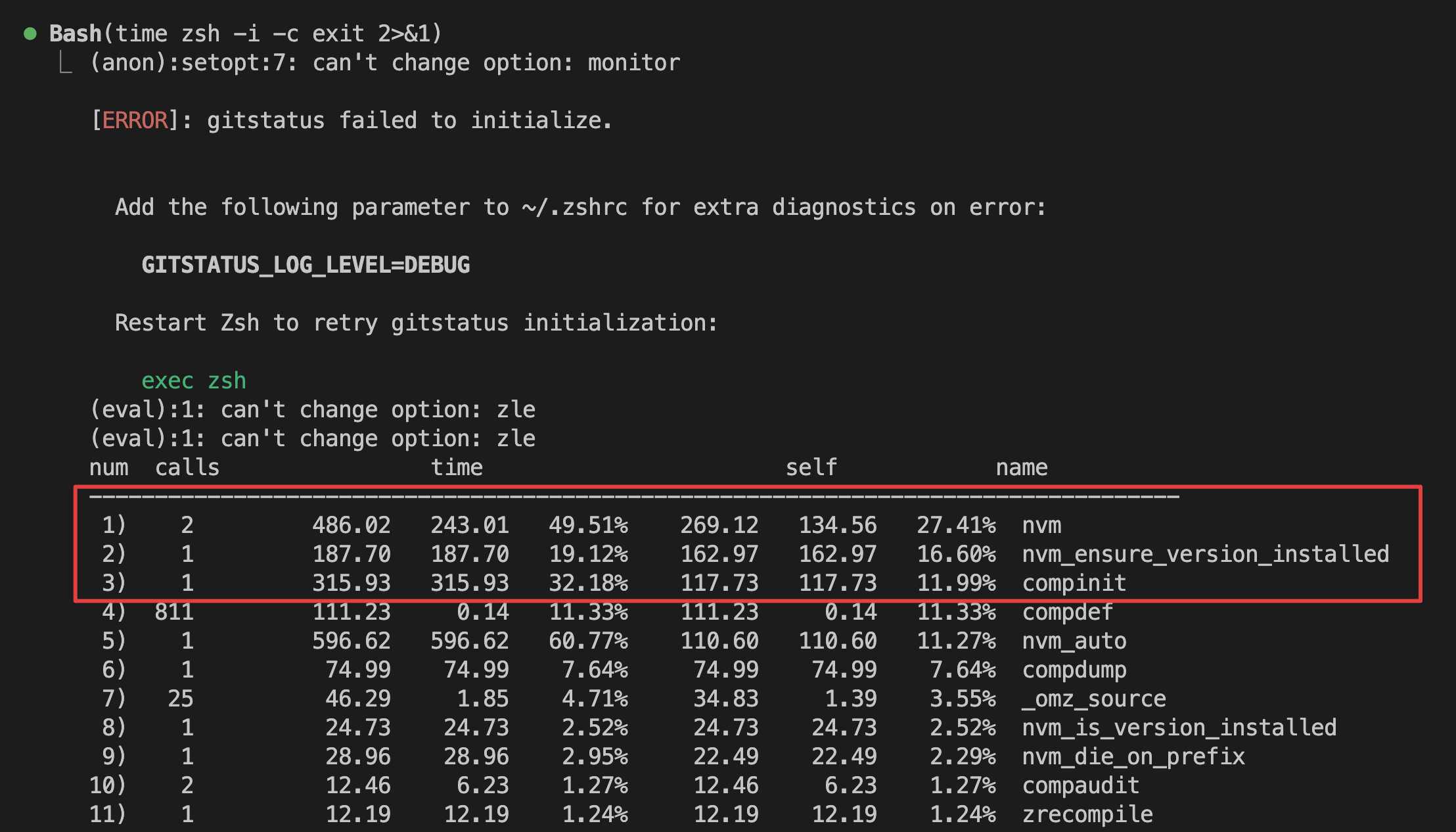 The time column includes time spent in sub-functions. So nvm_auto (597ms) calls nvm (486ms) which calls nvm_ensure_version_installed (188ms). They overlap, you cannot add them together. The real total for nvm is nvm_auto’s 597ms.